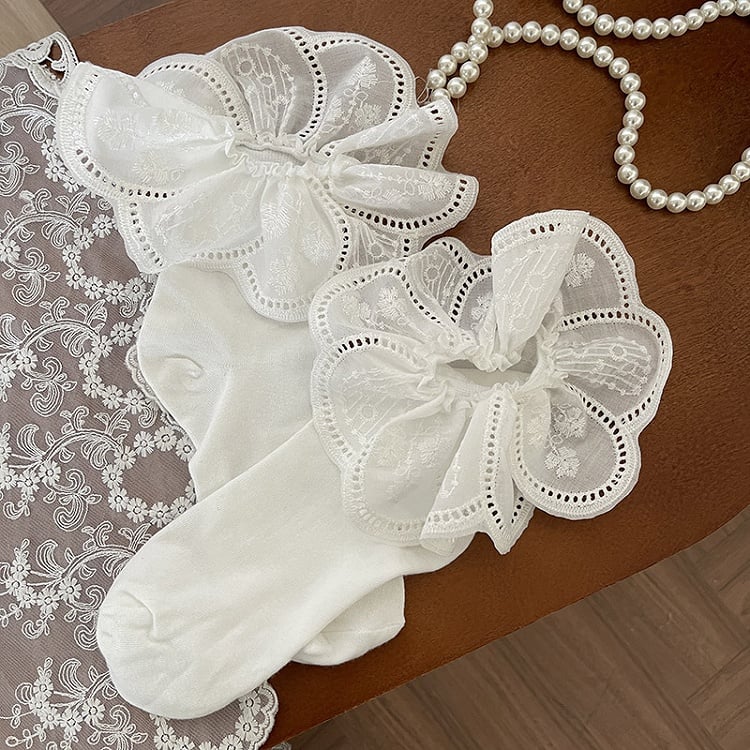 Lace Black/White Pattern Calf White Socks Trim with Floral