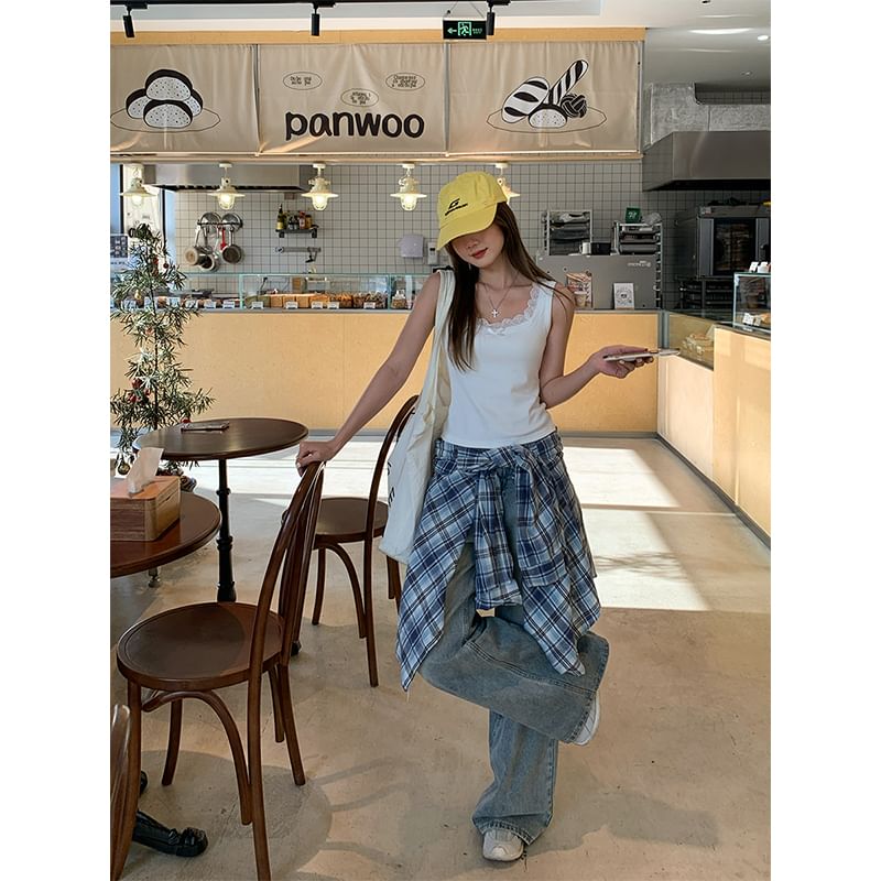 Lace Square Fit Tank Bow Neck Top Trim Plain Slim