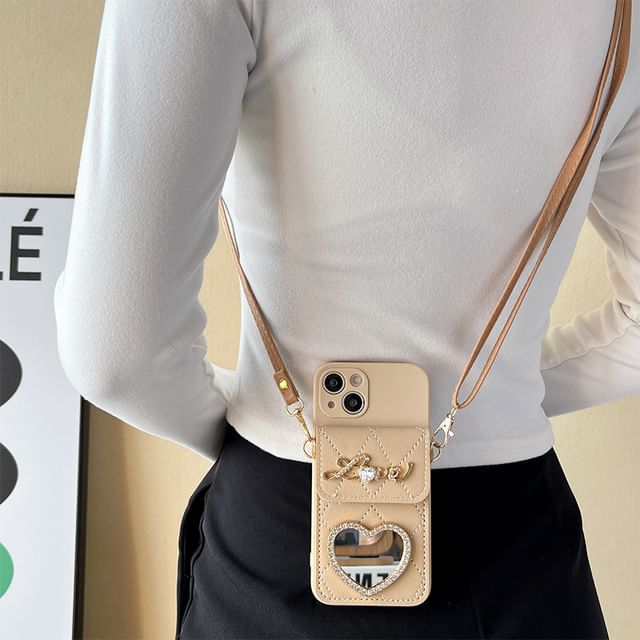 Lettering Mirror Lanyard Phone Case with Card Holder