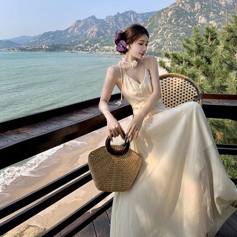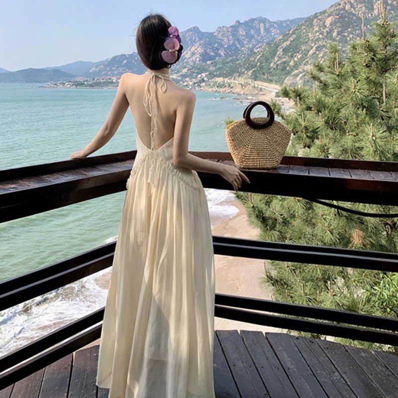 Maxi Back Open Plain Dress Ruched Frill Trim Halter A-Line V-Neck