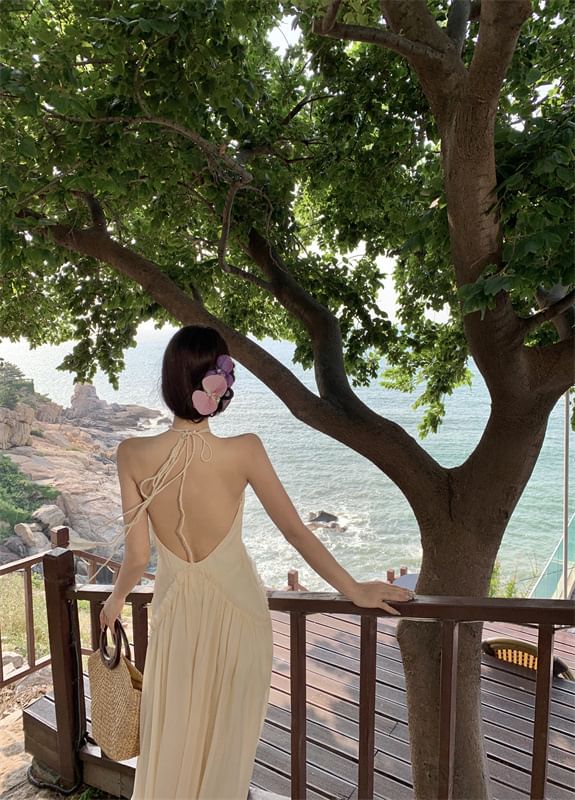 Halter V-Neck Plain Frill Trim Ruched Open Back Maxi A-Line Dress