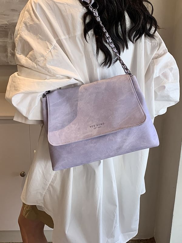 Lettering Chain Strap Flap Faux Leather Tote Bag