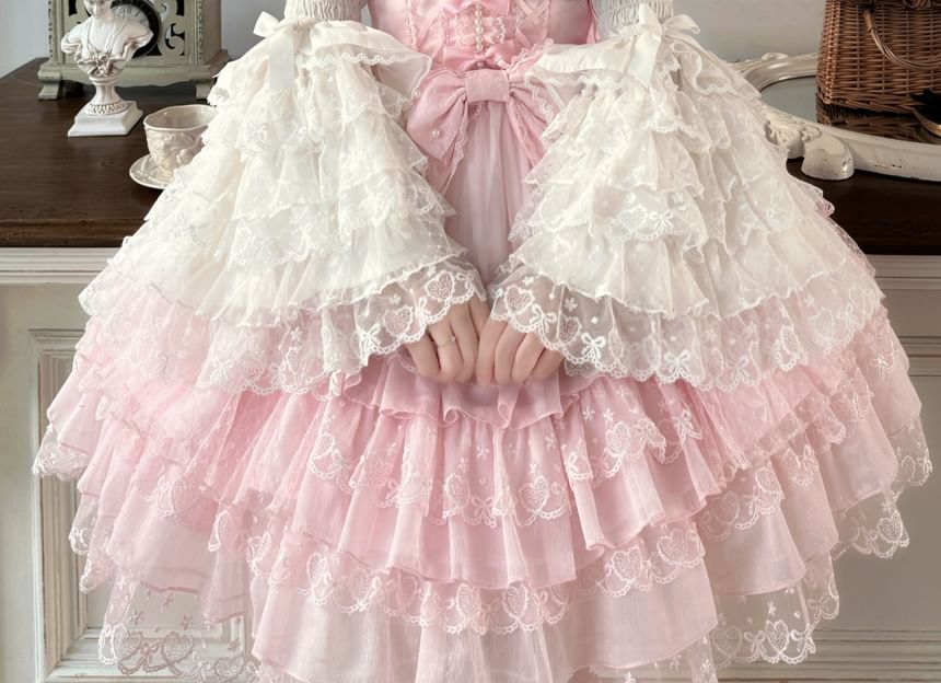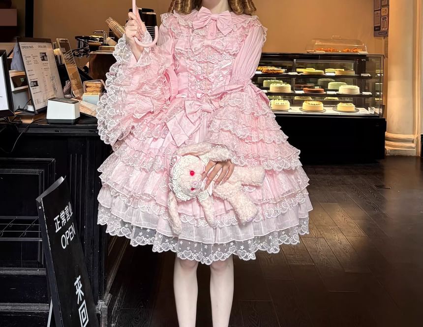 Bell Sleeve Collared Plain Bow Ruffle Panel Mesh Blouse