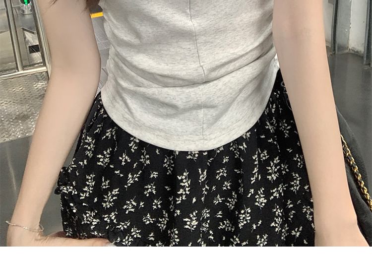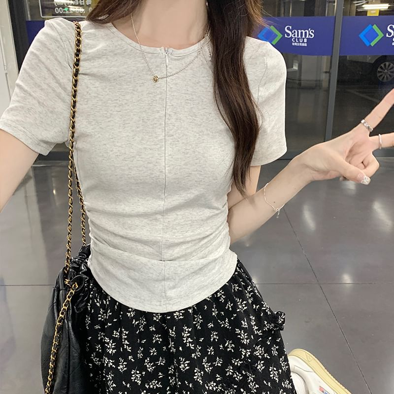 Fit Short-Sleeve T-Shirt Ruched Slim Round Neck Half-Zip