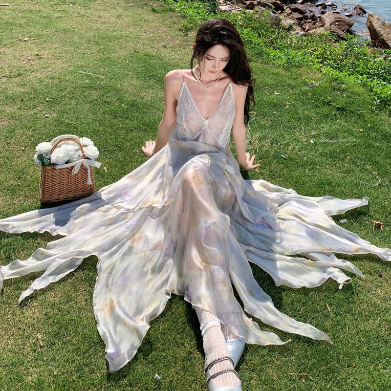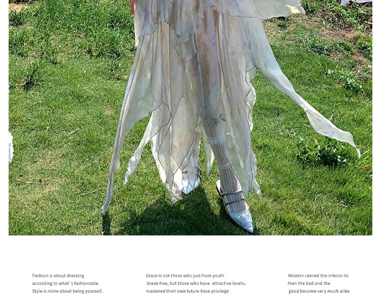 Floral A-Line Lace Spaghetti Sundress Strap Panel Midi Asymmetrical