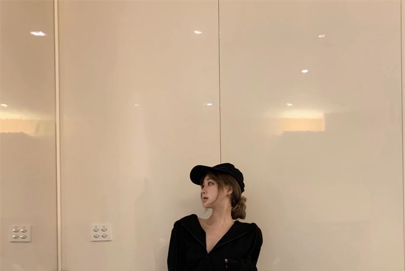 Plain Drawstring Crop Zip Hoodie / High Rise Two Tone Bootcut Sweatpants
