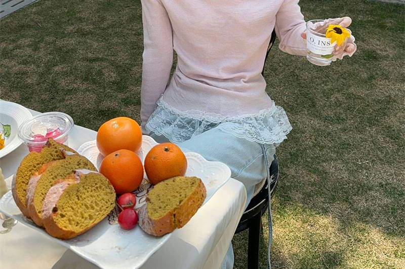 Mock Two-Piece Long-Sleeve Halter Lace Panel Slim Fit Tee