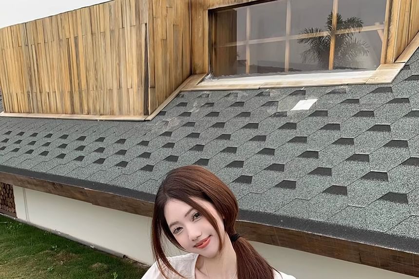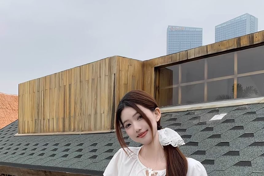 Short-Sleeve Notch Neck Plain Lace Panel Layered Tie Front Blouse