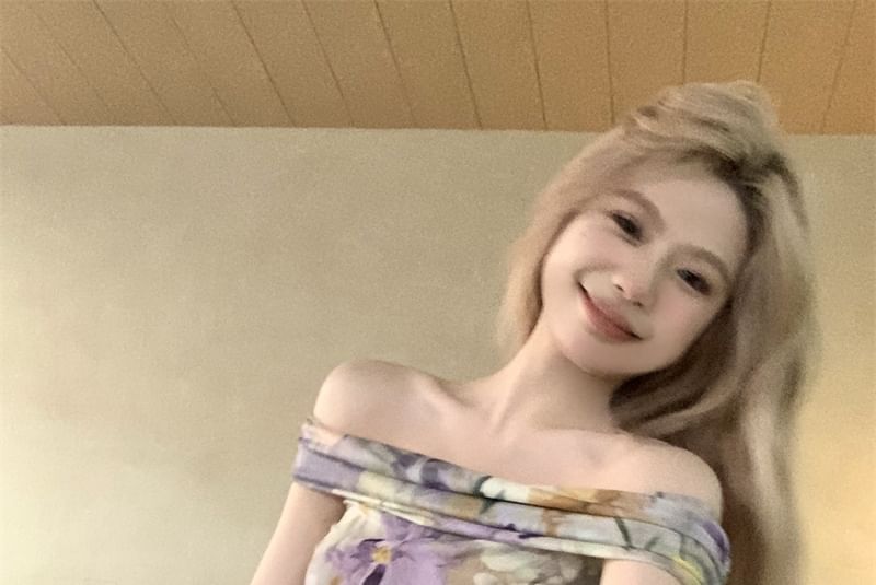 Short-Sleeve Off-Shoulder Floral Ruched Cropped Tee