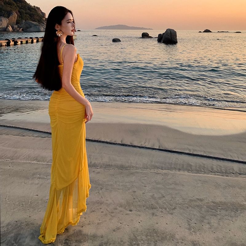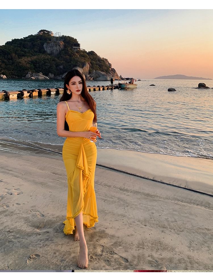 Plain Maxi Dress Strap Ruffle Hem Spaghetti Bodycon V-Neck