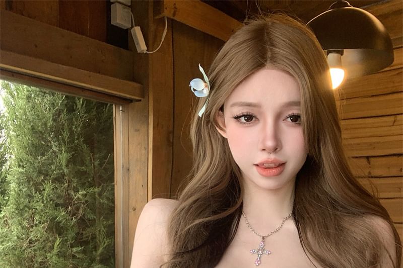 Floral Applique Ruched Lace Trim Panel Mesh Crop Tube Top