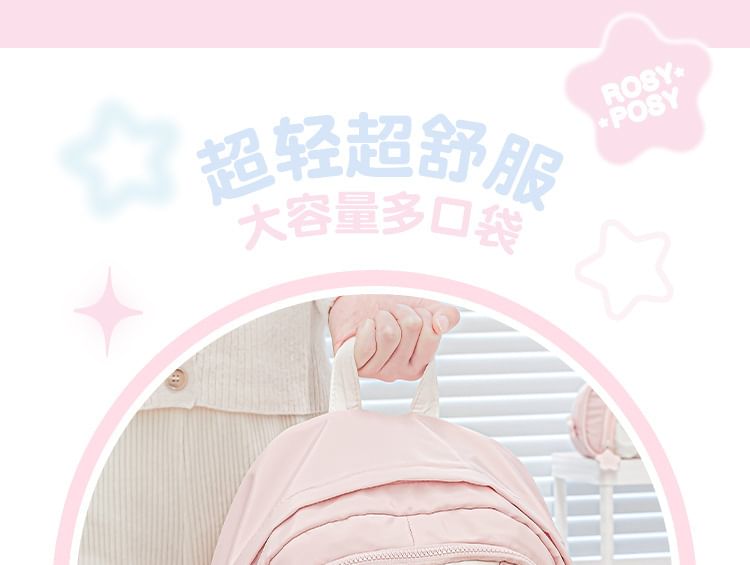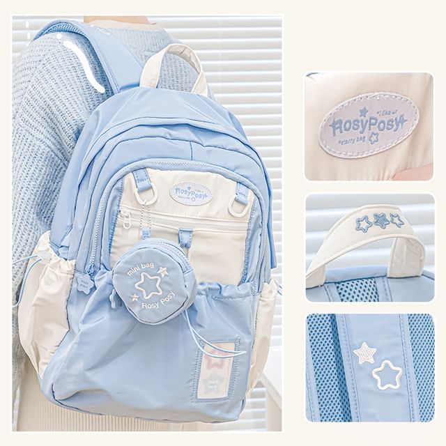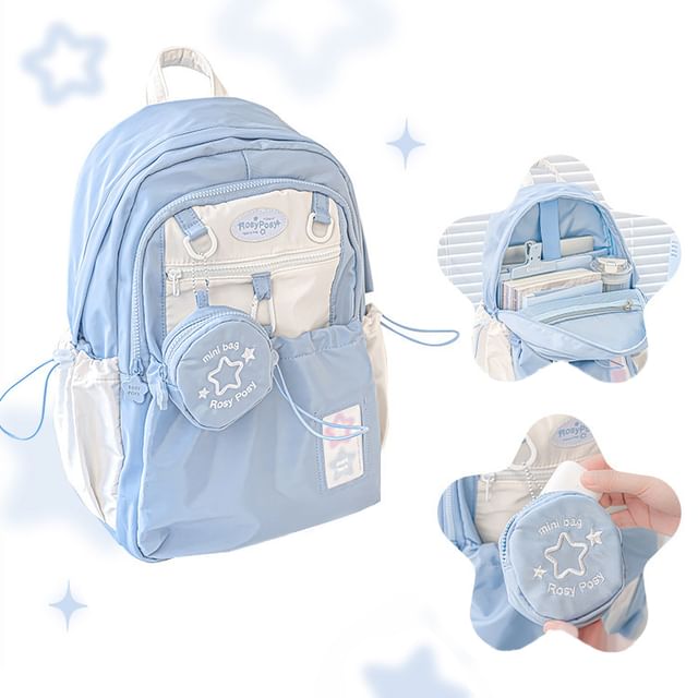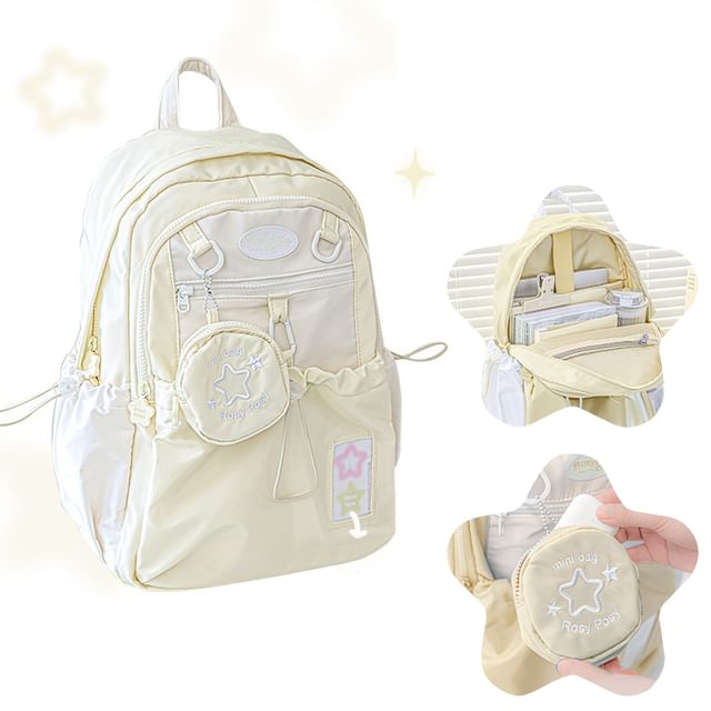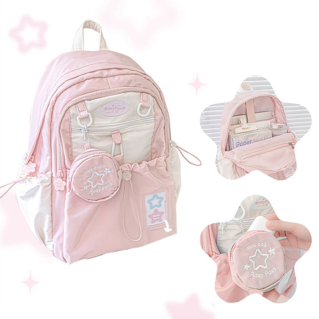 Set: Star Embroidered Drawstring PVC Panel Nylon Backpack + Coin Purse