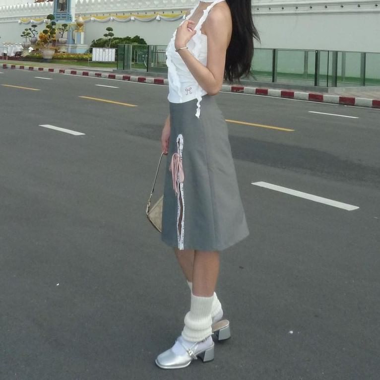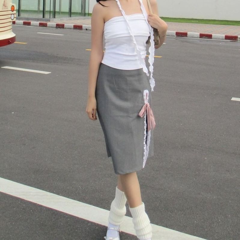 Skirt Plain Lace Trim Rise High Ribbon Pencil Midi