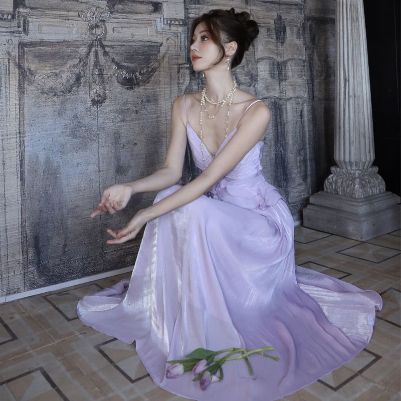 Spaghetti Maxi Strap Trim V-Neck Ruffle Plain A-Line Dress