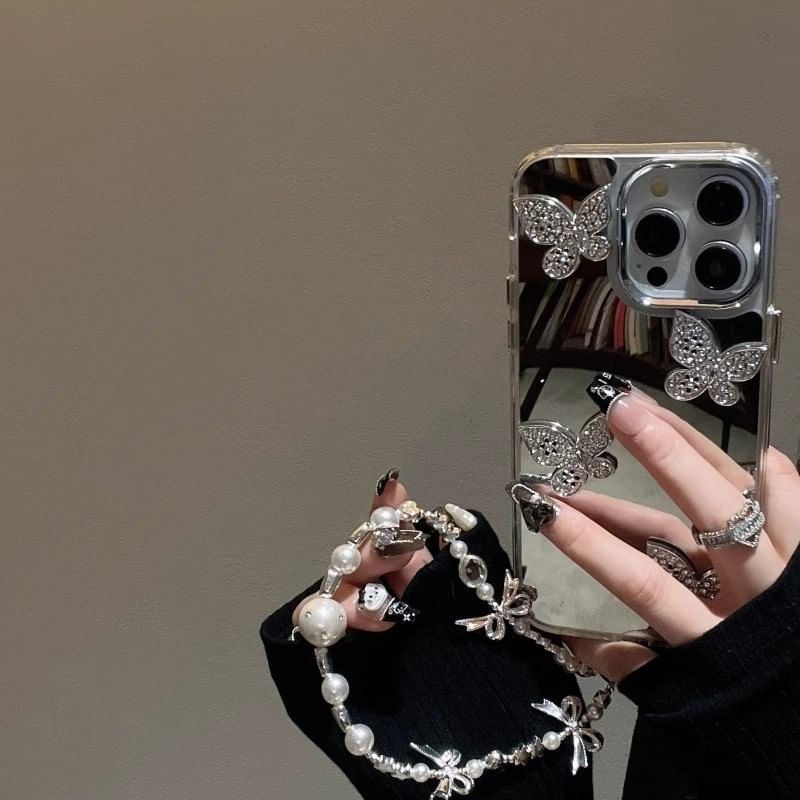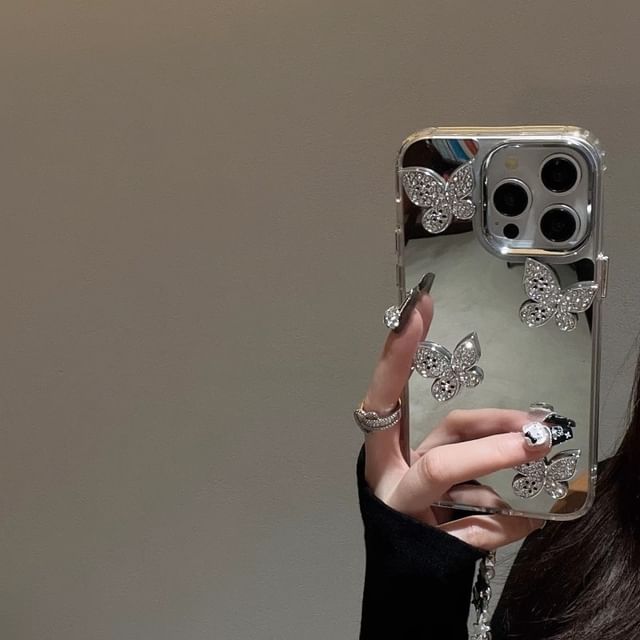 Mirrored Phone Case with Butterfly Adhesive Decoration / Strap / Set