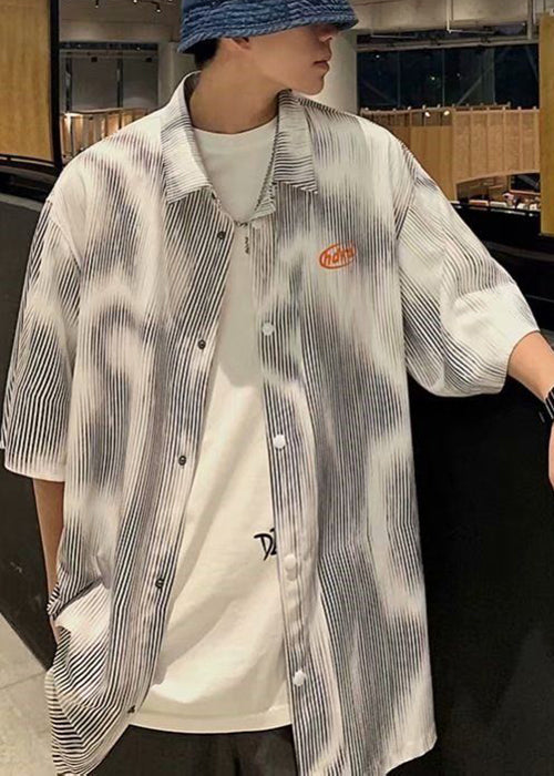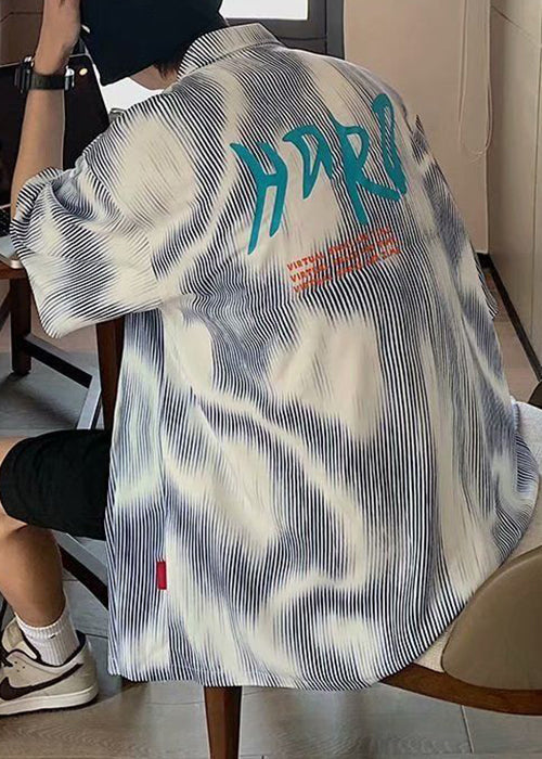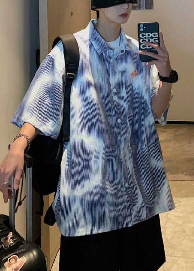 New Blue Striped Button Cotton Mens Shirts Half Sleeve