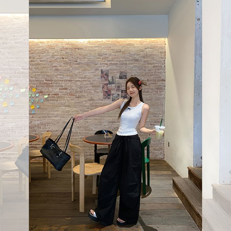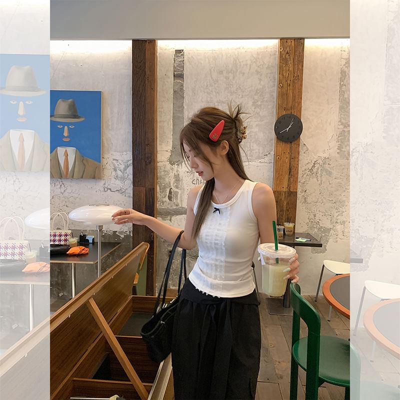 Crew Tank Fit Lace Top Neck Slim Bow Panel