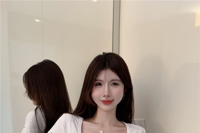 Short-Sleeve Square Neck Rhinestone Plain Crop T-Shirt