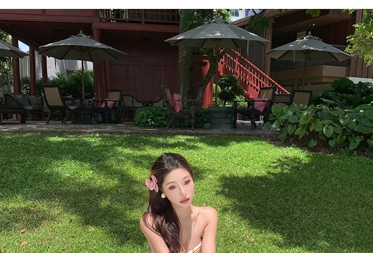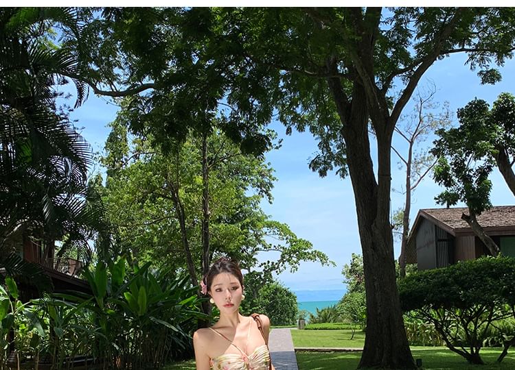 Cutout Halter Maxi Dress Print Floral A-Line Pleated Back Open Neck