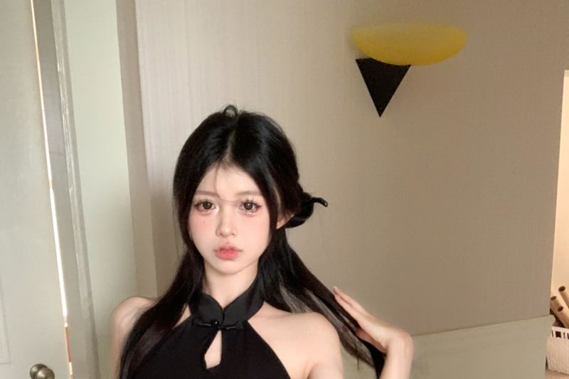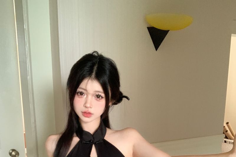 Halter-Neck Floral Jacquard Keyhole Mini Bodycon Dress