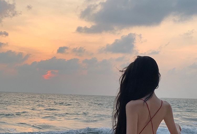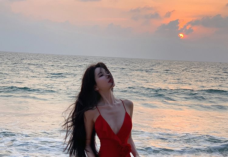 Dress Ruffle V-Neck Maxi Strap Plunge Open Trim Back A-Line Spaghetti Plain Slit