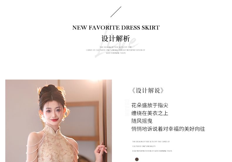 Evening Stand Pearl Dress Faux A-Line Fringed Collar Floral Jacquard Halter Neck