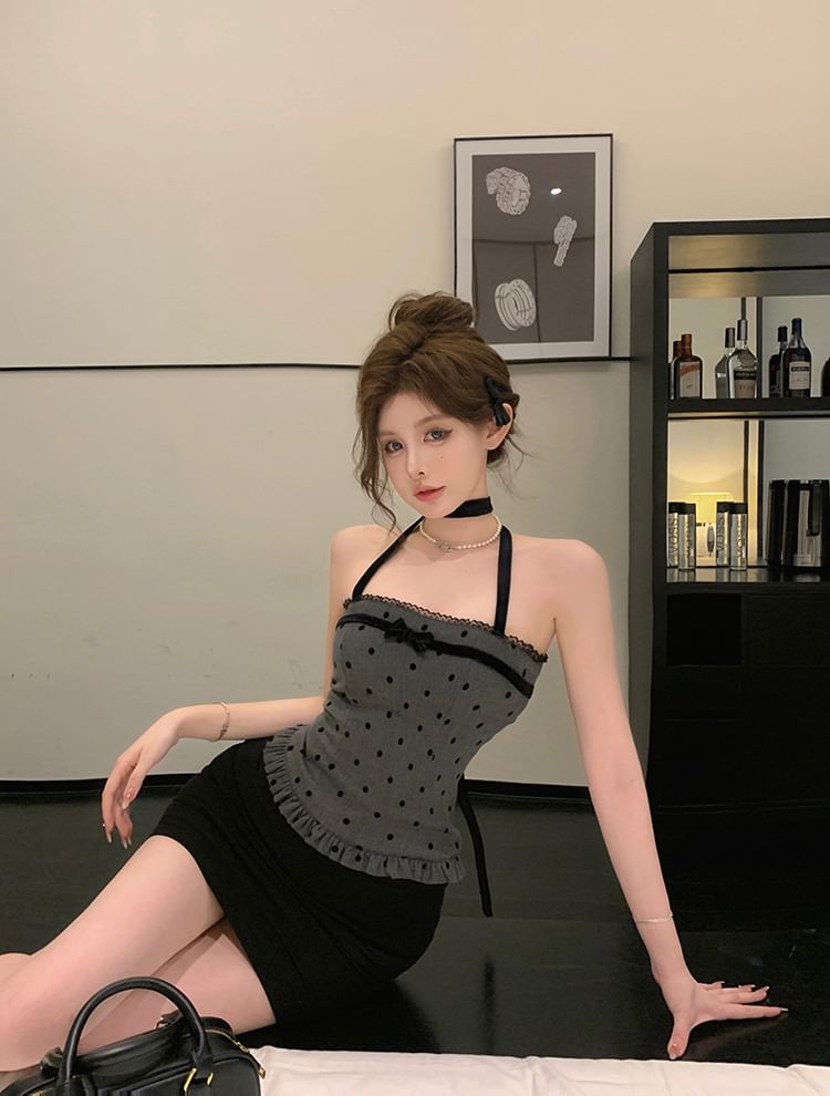Halter-Neck Dotted Bow Ruffle Trim Top