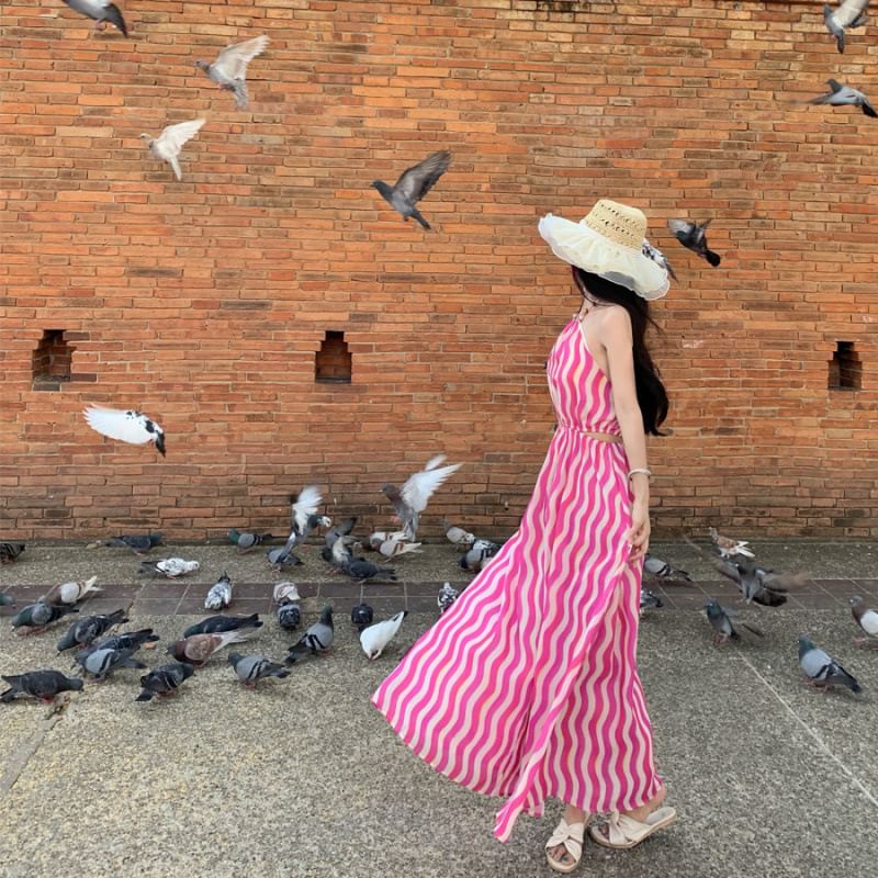 Halter Sleeveless Maxi Wave Dress A-Line Neck Striped