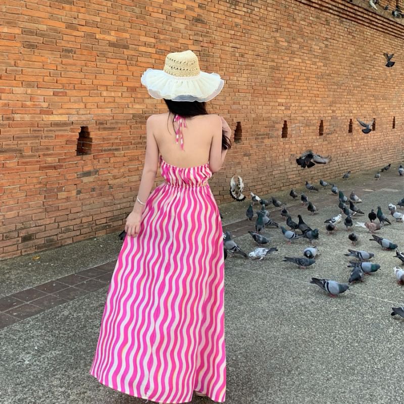 Sleeveless Halter Neck Wave Striped Maxi A-Line Dress
