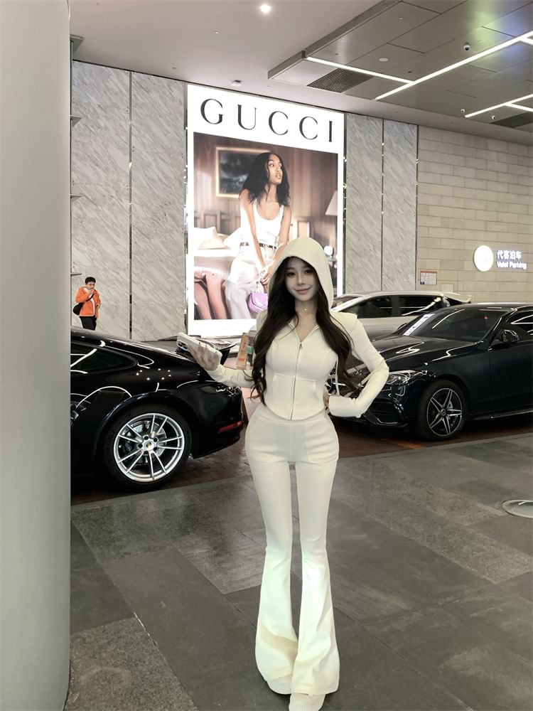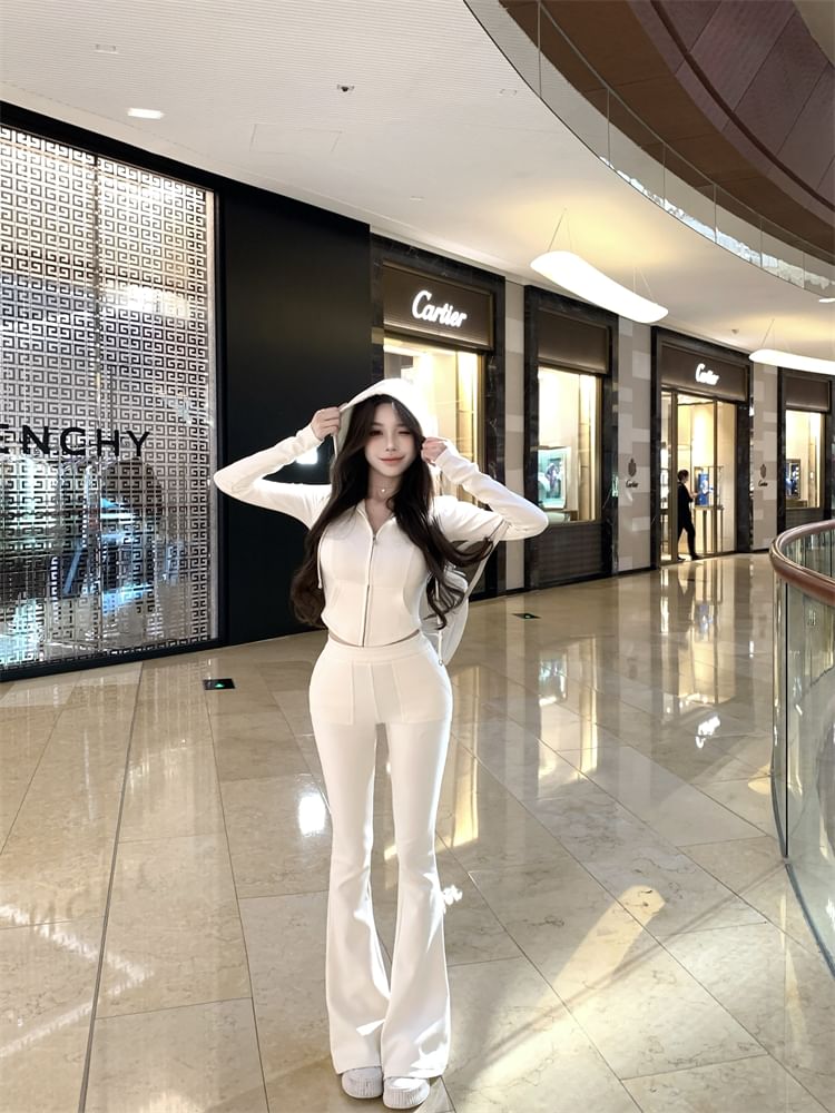 High Crop Zip Waist Flared Sweatpants / Plain Hoodie