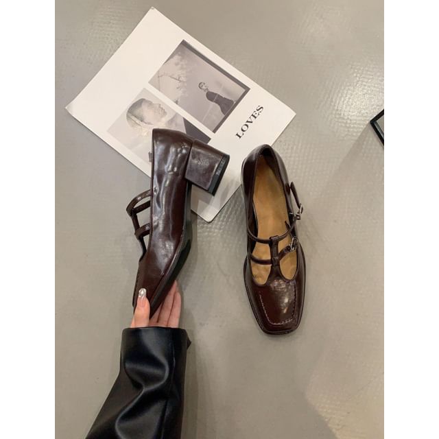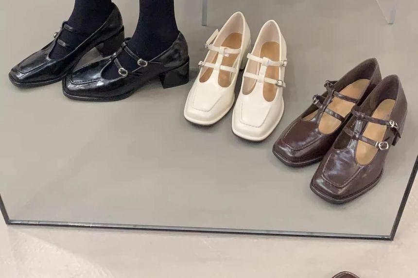 Jane Chunky Plain Mary Heel Pumps T-Strap Square Toe