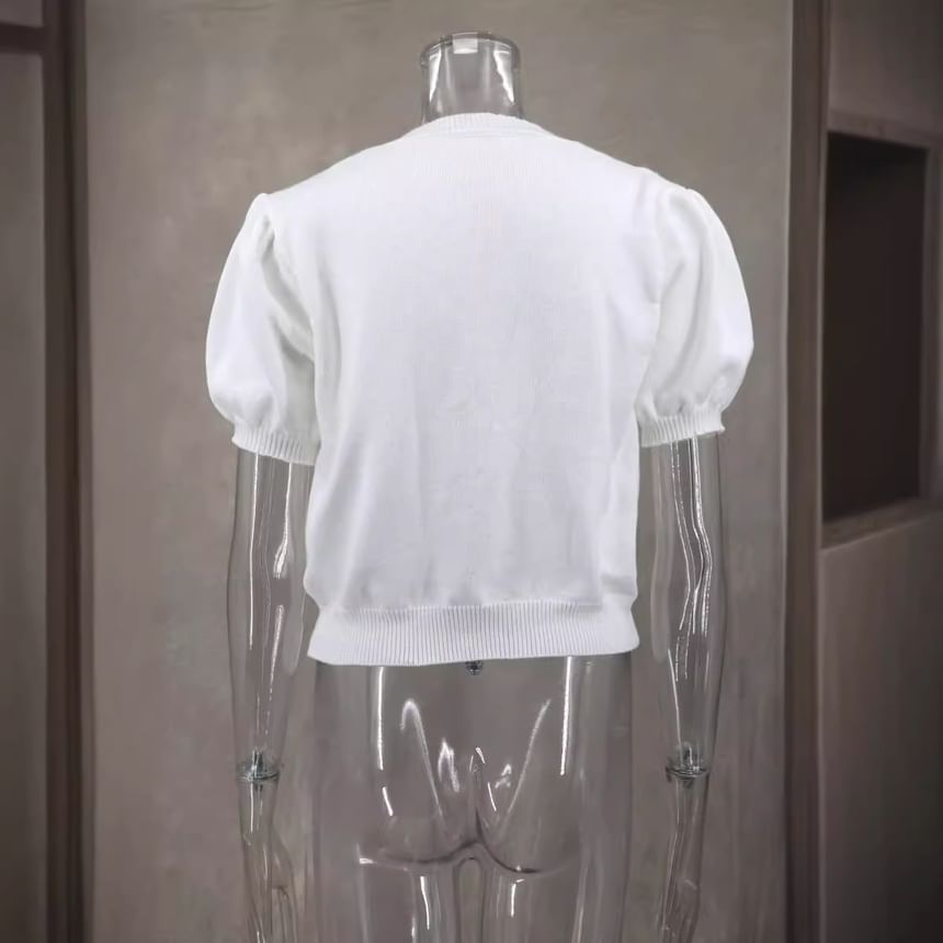 Knit Tone Bow Crop Two Accent Top Puff-Sleeve V-Neck