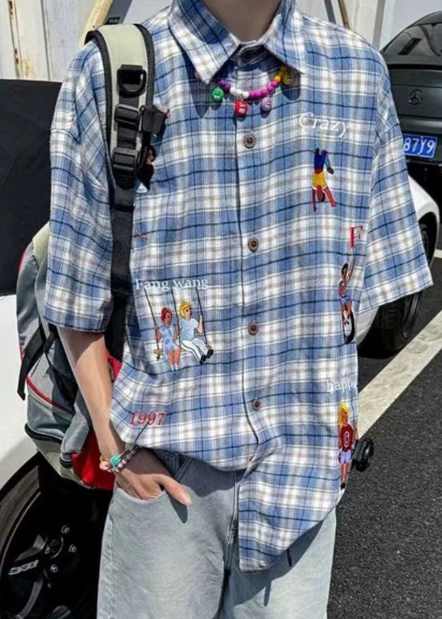 Classy Blue Plaid Print Button Cotton Men's Shirts Half Sleeve