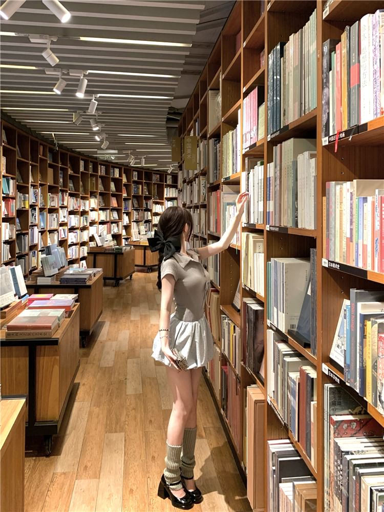 Mock Two-Piece Short-Sleeve Collar Bow Ribbed Knit Panel Bubble Hem Mini A-Line Dress