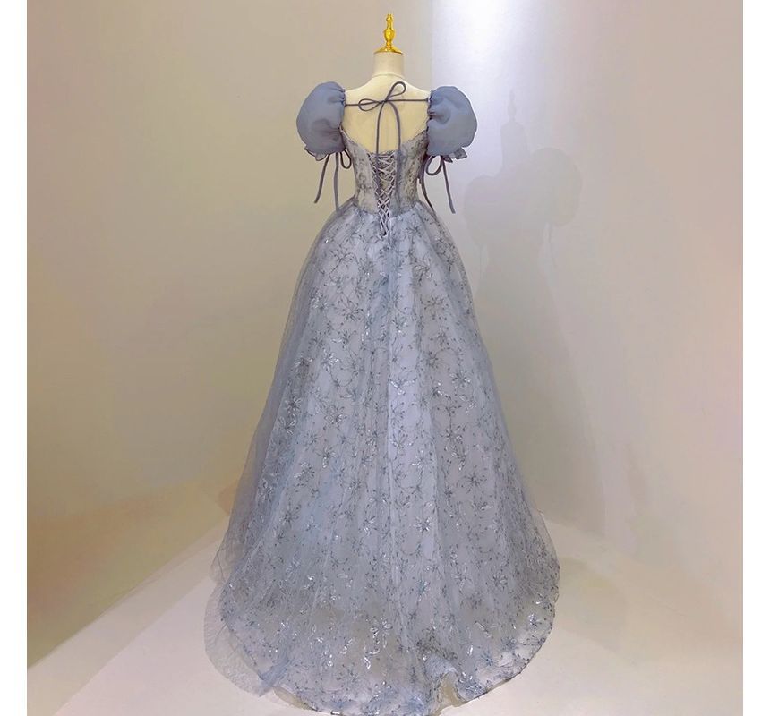 Puff Sleeve Sweetheart Neck Floral Patterned Sequin Mesh A-Line Evening Gown