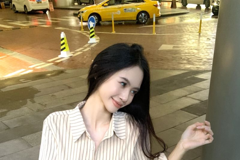 Skirt Waist Striped / Pencil Button Up Collared High Long-Sleeve Print Mini Leopard Shirt