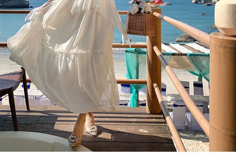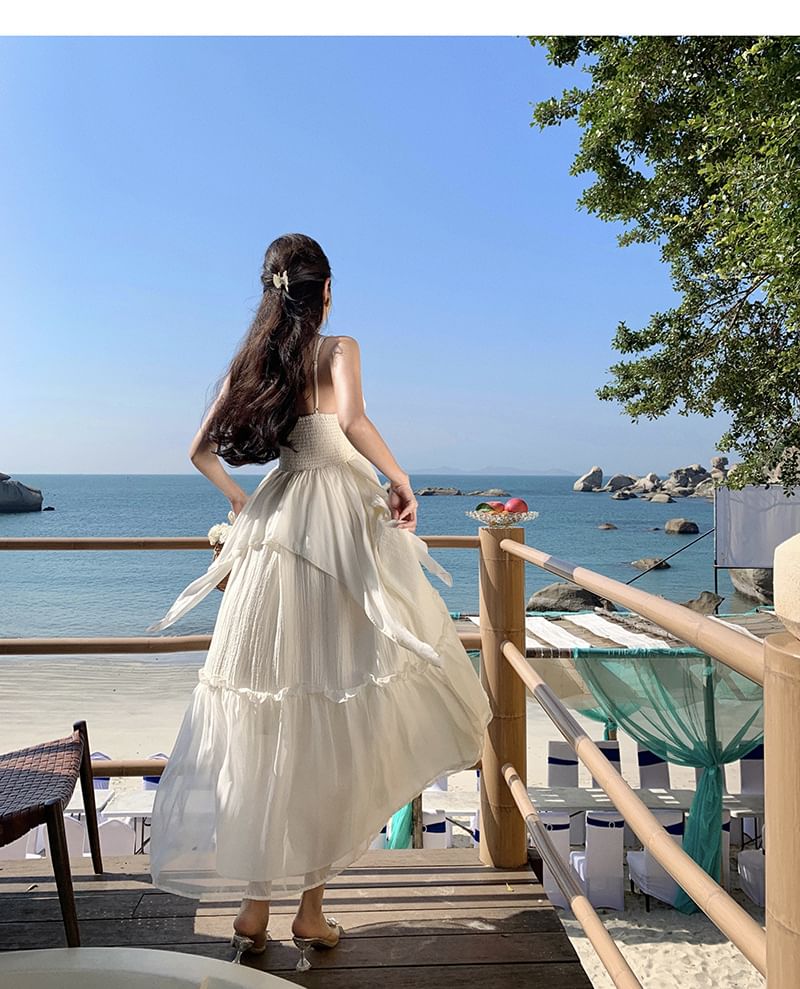 Spaghetti A-Line Maxi Dress Strap V-Neck Plain Ruffle Trim