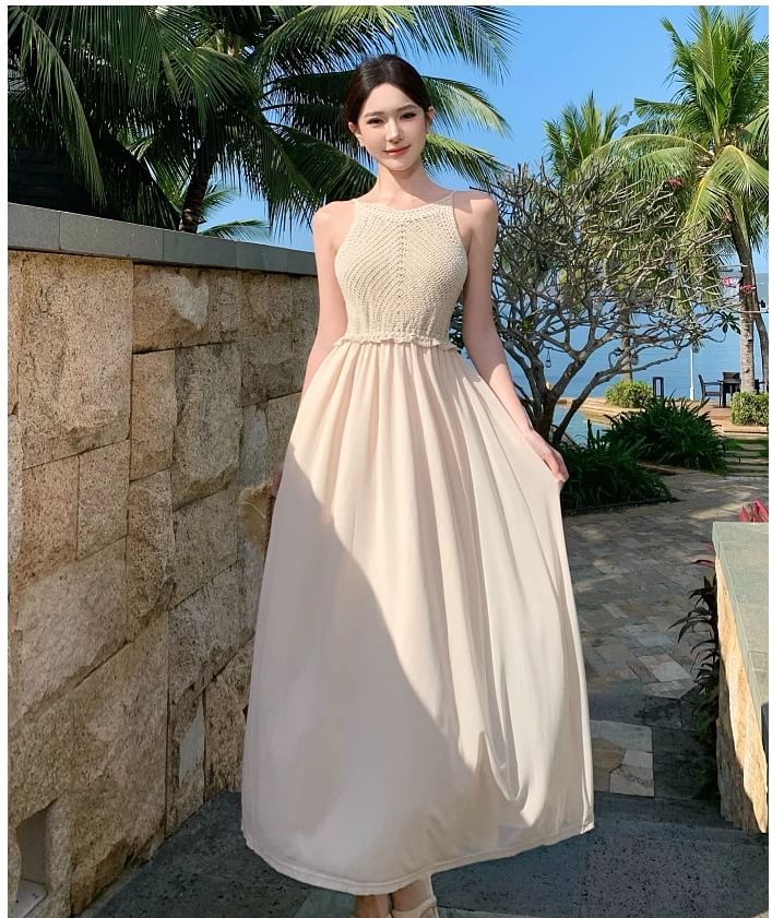 Spaghetti Strap Plain Knit Panel Maxi A-Line Dress