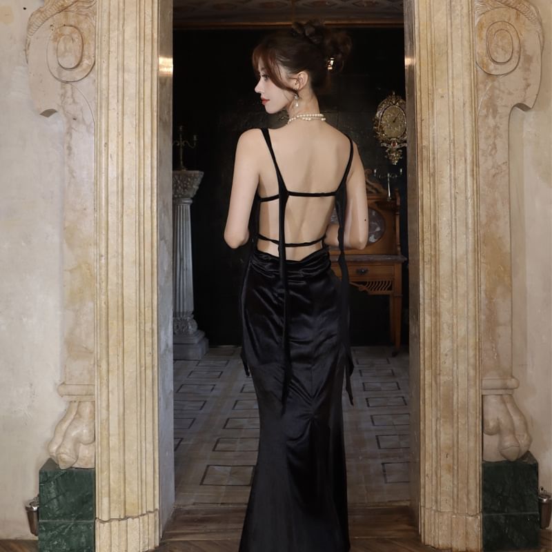 Spaghetti Strap Sweetheart Neck Plain Ruched Maxi Sheath Dress