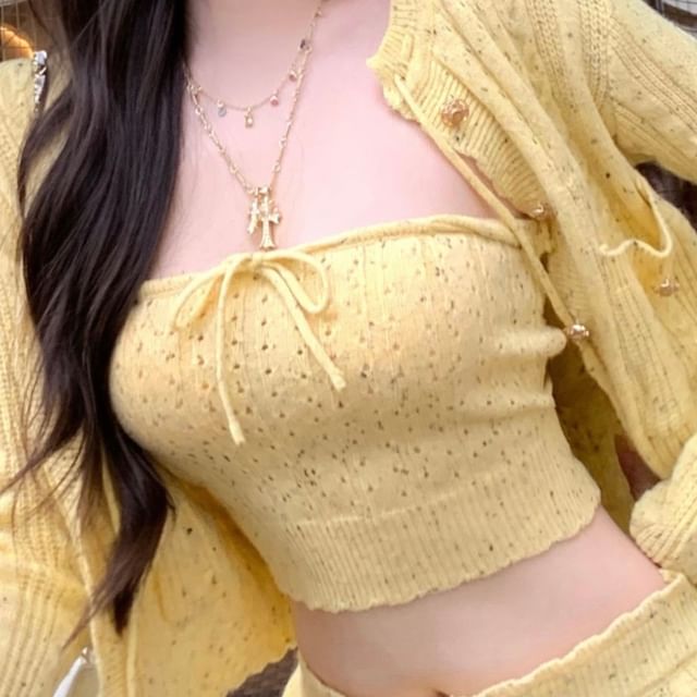 Speckle Perforated Tie Front Knit Crop Tube Top / Drawstring Waist Hot Pants / Cardigan