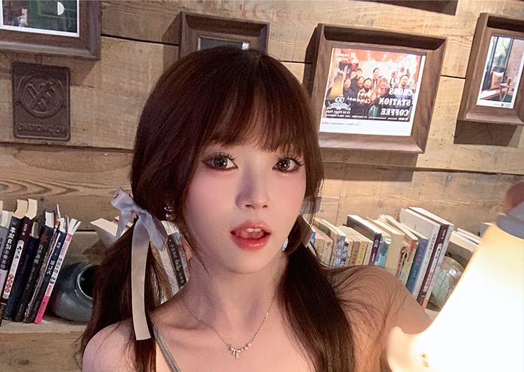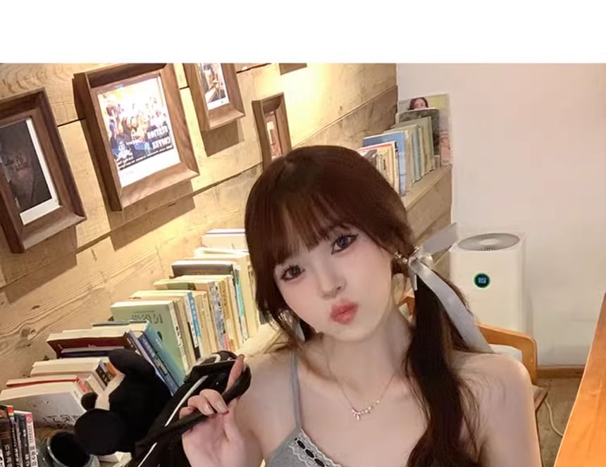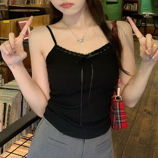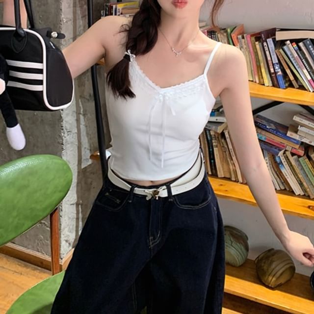 V-Neck Accent Crop Cami Plain Top Lace Trim Bow