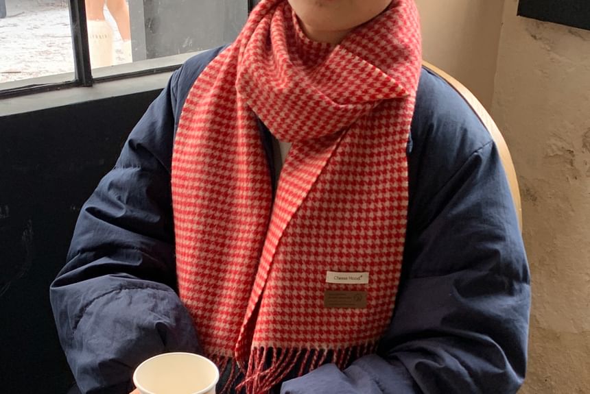 Plaid Applique Fringed Trim Scarf