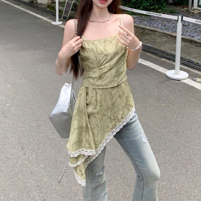 Patterned Print Asymmetrical Lace Trim Camisole Top