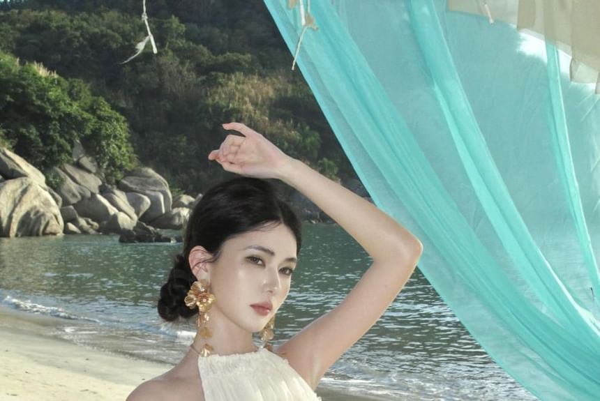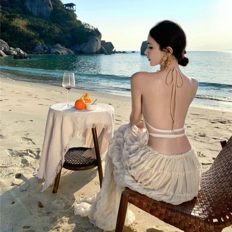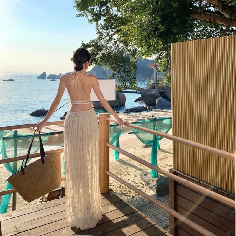 Cami Halter Set: Rise Skirt Plain High Maxi + Neck Crop Top A-Line