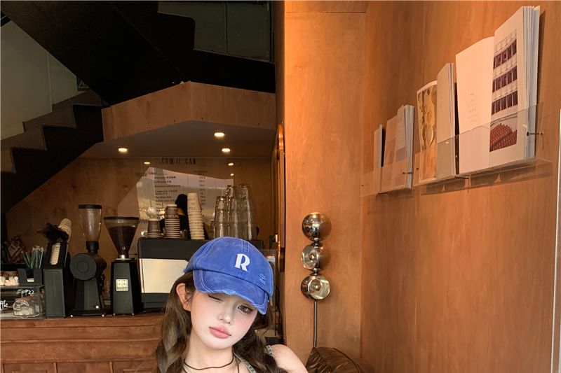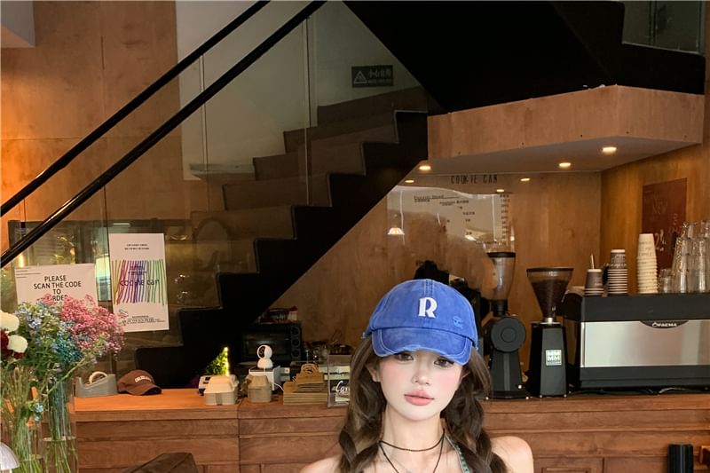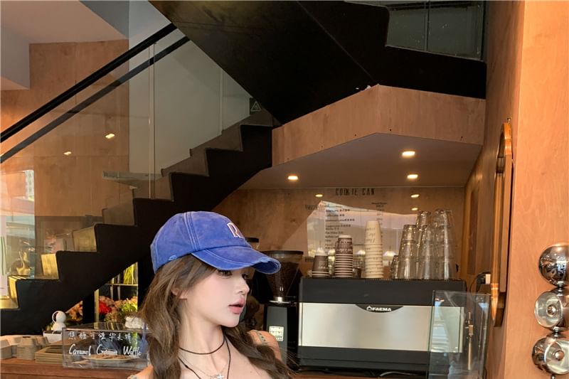 Set: Halter Denim Button Crop Slim Fit Camisole Top + High Waist Studded Frayed Belted Mini Pencil Skirt