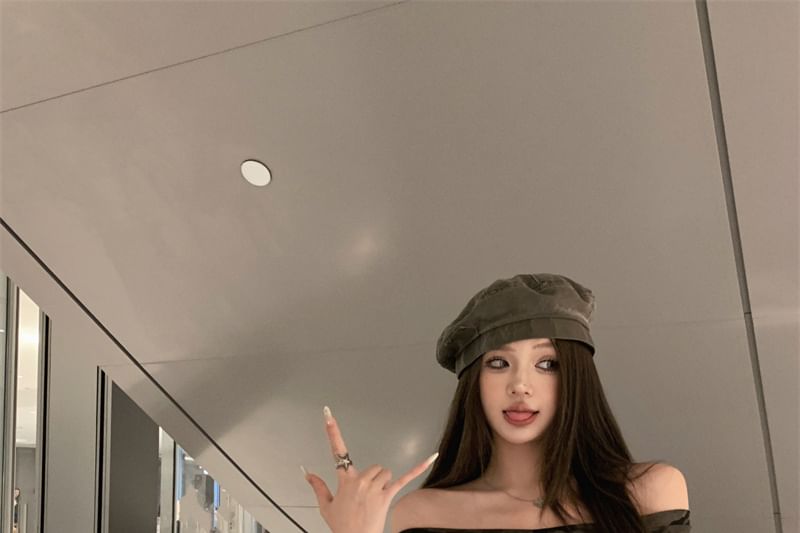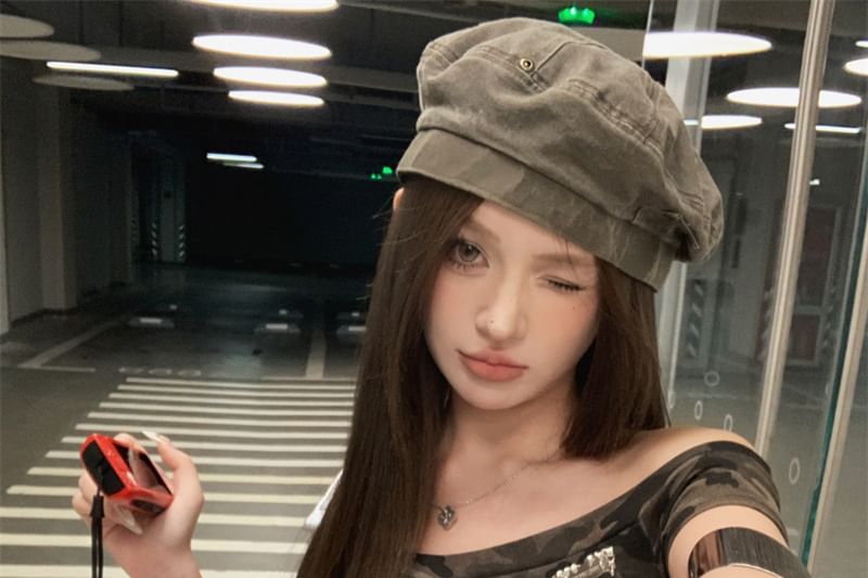 Cap-Sleeve Off-Shoulder Camo Print Asymmetrical Ruffle Trim Slim Fit Tee