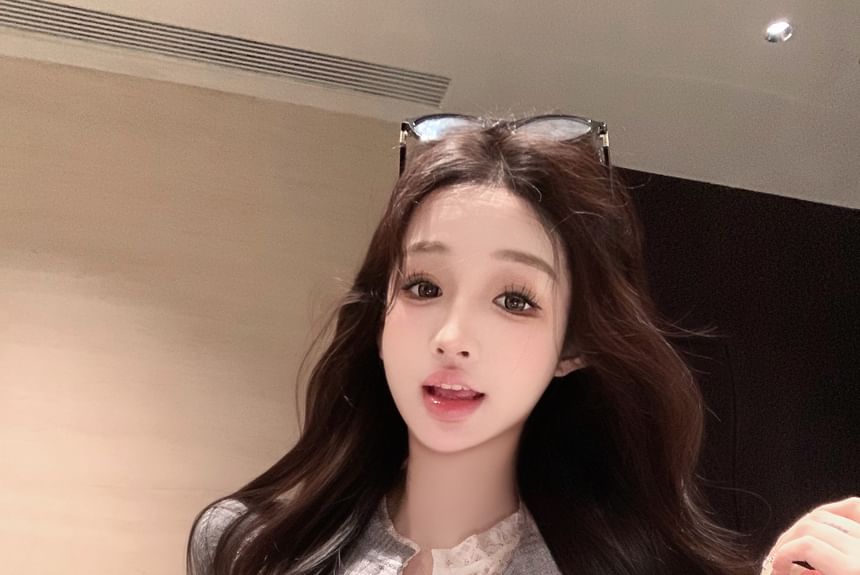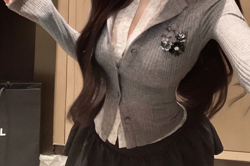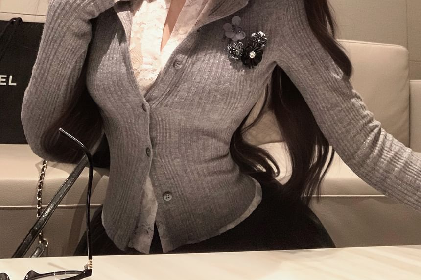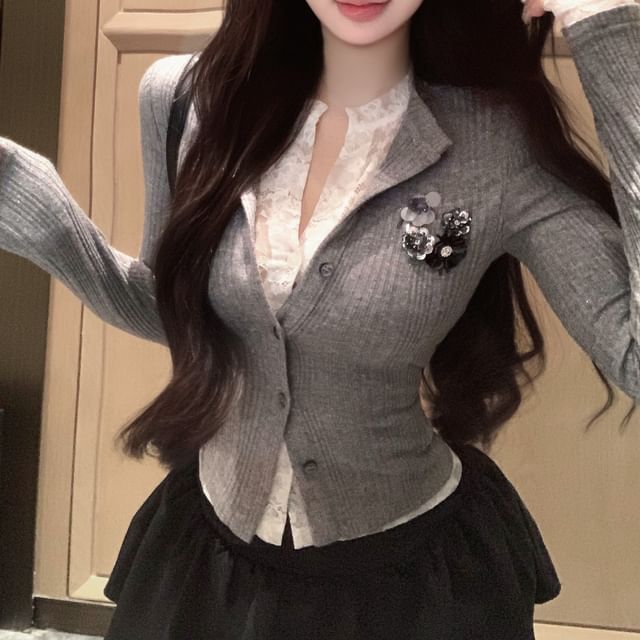 Plain Lace Trim Mock Two-Piece Ribbed Slim Fit Cardigan