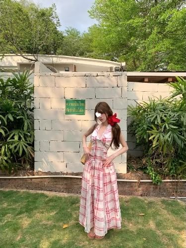 Halter Lace Panel Midi A-Line Dress Plaid Open Back