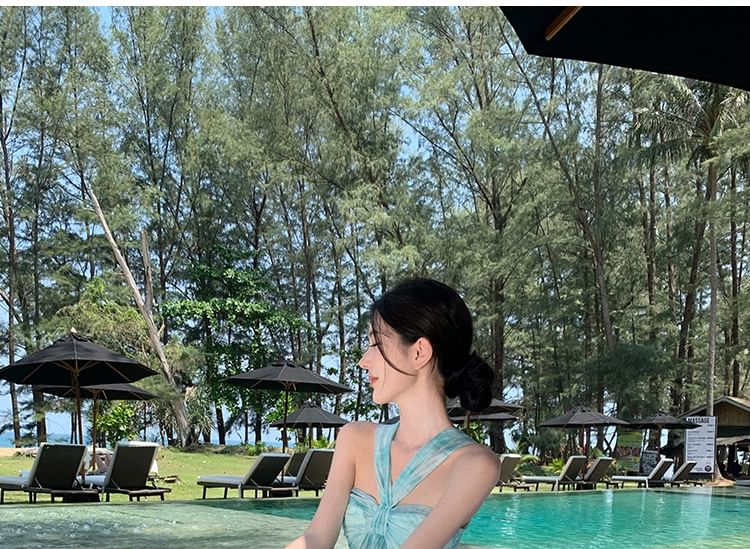Tie Dye Halter Neck Ruffle Hem Maxi A-Line Dress