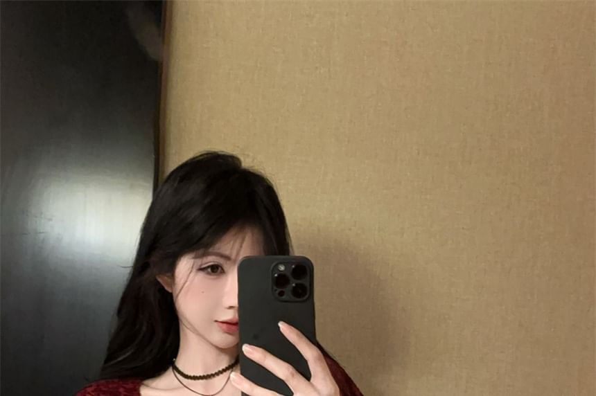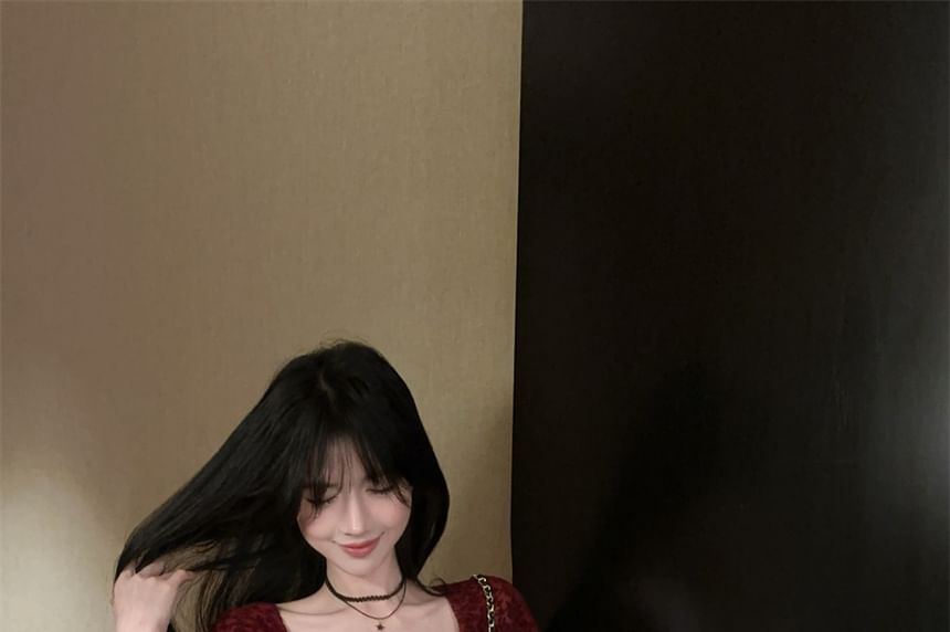 Short-Sleeve Square Neck Slit Hem Lace Top